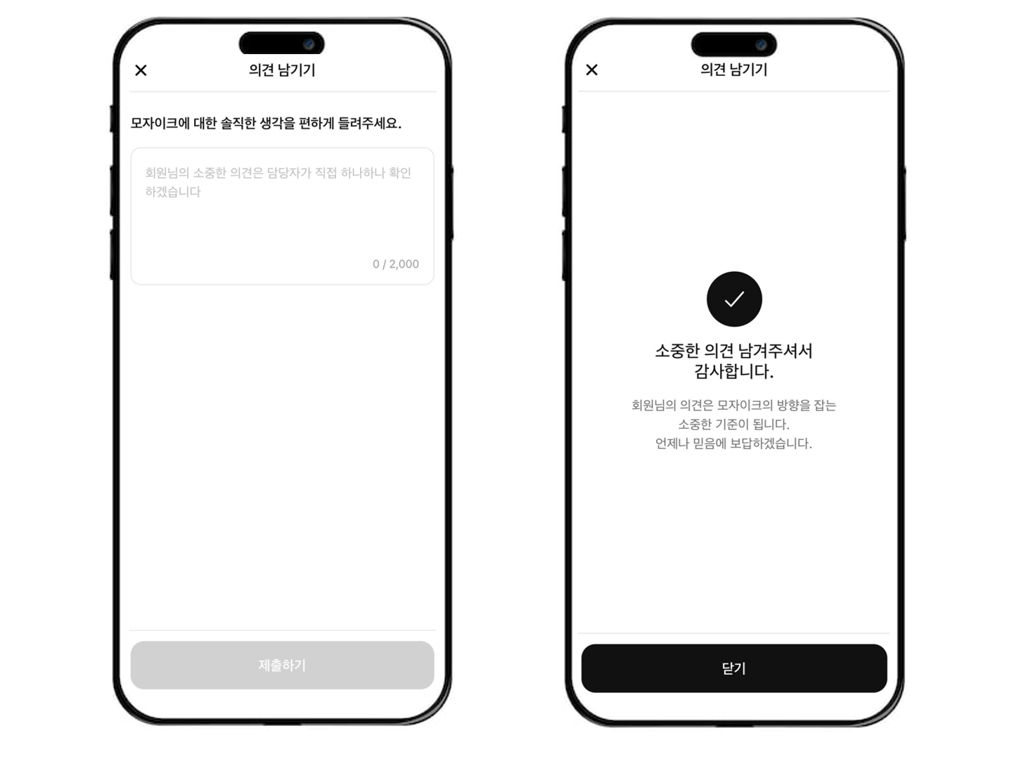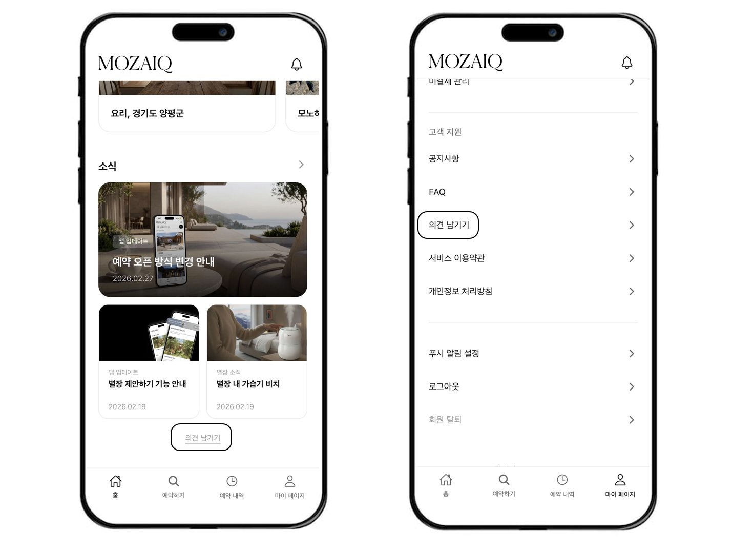 또한 모자이크 서비스 전반에 대해 자유롭게 이야기를 남길 수 있는 의견 남기기 메뉴도 새롭게 선보입니다. 이용하시면서 느끼신 사소한 불편함이나 보완이 필요한 부분, 혹은 만족스러웠던 순간까지 무엇이든 편하게 남겨 주세요.