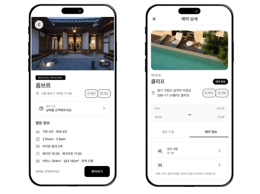 더불어 별장을 찾아오시는 길이 한결 수월해졌습니다. 별장 정보 페이지 또는 예약 상세 페이지에서 주소 옆에 배치된 복사 버튼을 터치하여 주소를 간편하게 저장하실 수 있습니다.