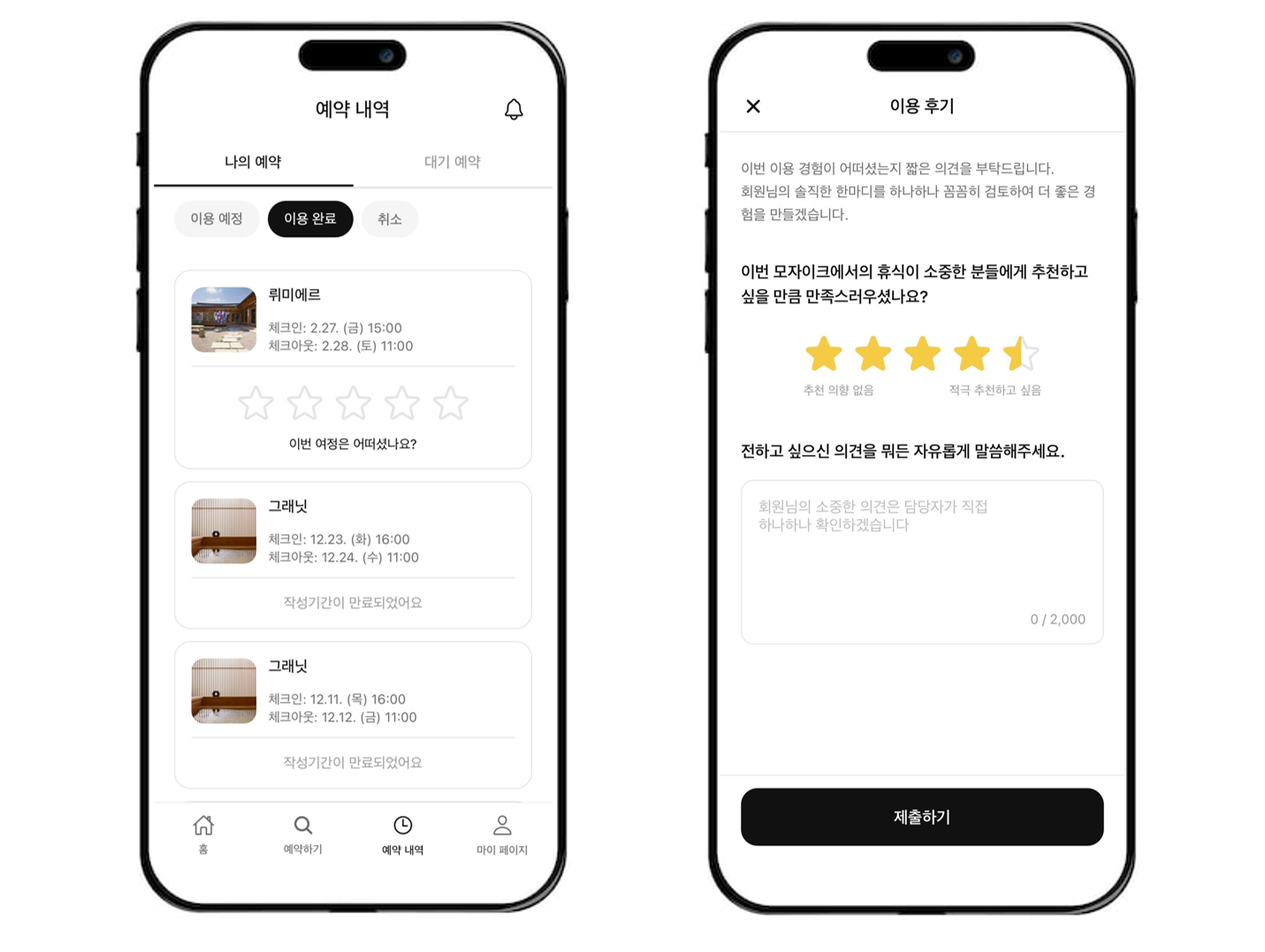 이용 후기와 의견 남기기를 통해 별장 이용 경험과 모자이크 서비스 전반에 대한 의견을 전달하실 수 있습니다