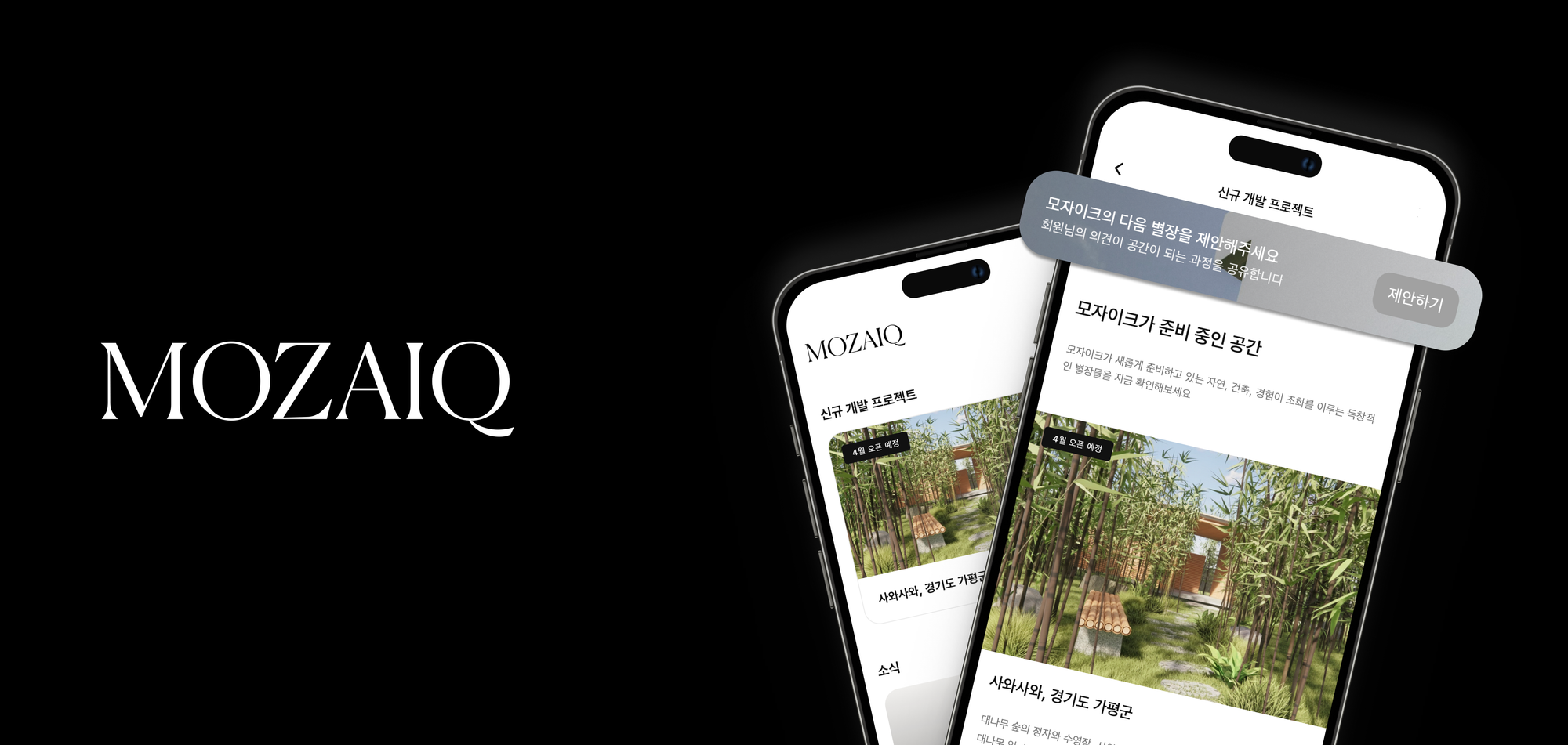 모자이크가 준비 중인 신규 별장 개발 과정에 회원님께서 직접 의견을 전달하실 수 있도록 앱 내 [신규 개발 프로젝트] 페이지에 ‘제안하기’ 기능을 마련했습니다.