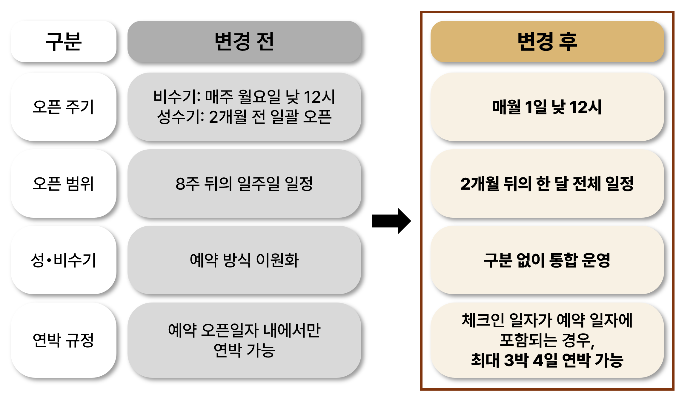 회원님들께서 보내주신 다양한 의견과 여러 이용 상황을 함께 고려하여 정책을 조정하고 있으며, 새로운 정책이 적용되기 전까지는 기존 예약 오픈 일정이 동일하게 유지됩니다.